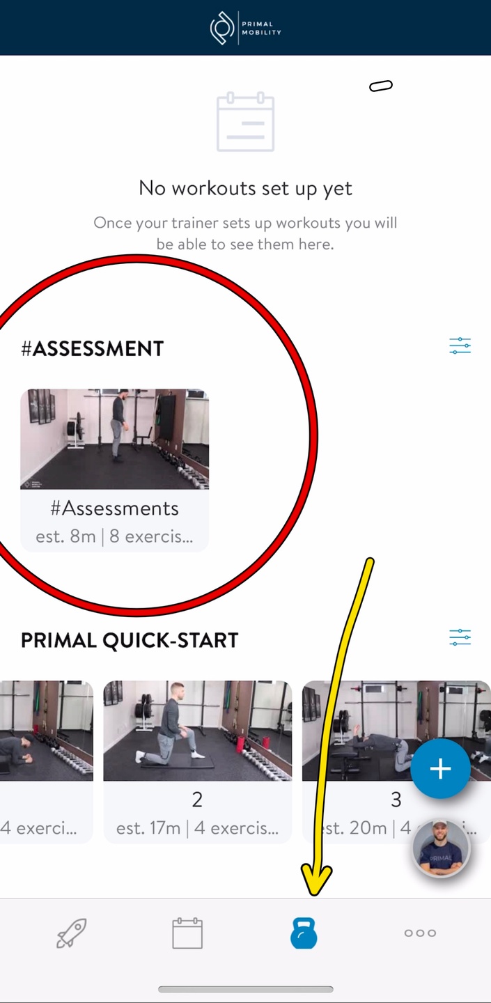 In the Primal Mobility App, click the kettlebell to view your custom programming. You will see that the first workout available is titled “#Assessments.”